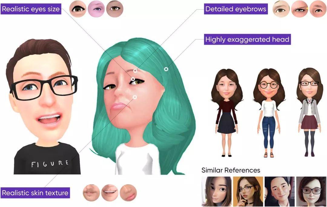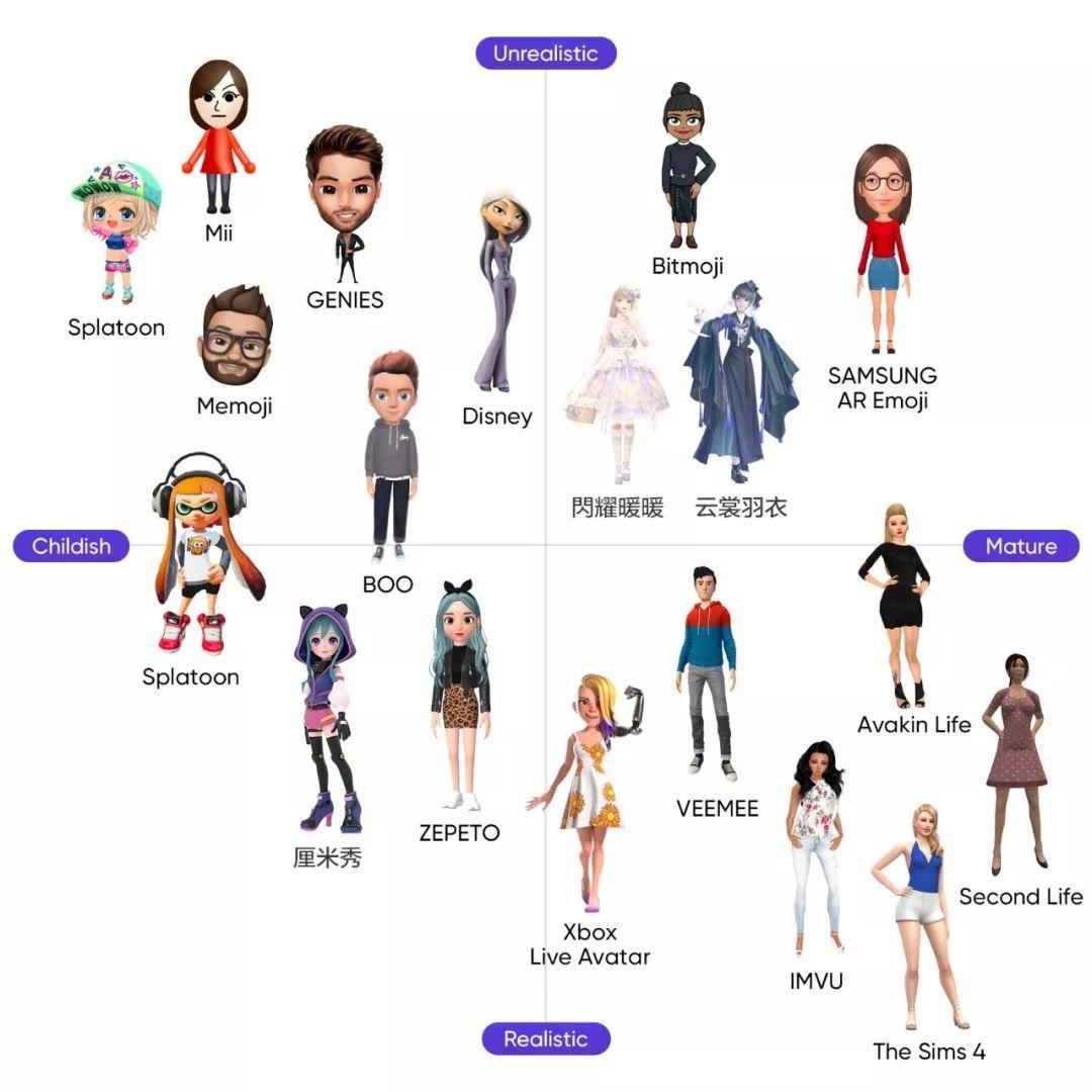 因为角色必须保持视觉的完整性,同时由于服务的性质,要如实地捕捉人脸,所以设计一个同时满足这些条件而又能吸引用户的角色是一项艰巨的任务。当变形、造型和真实在角色风格上以和谐比例混合时,这项服务能吸引许多用户。最近大部分服务都向3D角色看齐,它们在立体感和现实感上都非常出色,能产生与众不同的风格。