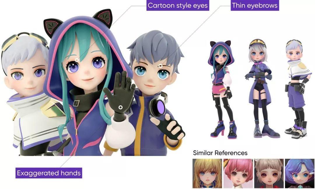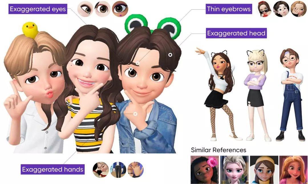 Zepeto追求完美平衡的外观,根据亚洲人的面部特征,他们减少眼睫毛的体积,使其变薄,把眼睛的倾斜度调到一个柔和的程度,以此给人温和感。另外,头部和手部被夸张地放大,这样面部表情和手部运动在不同角度都能很好地看到。