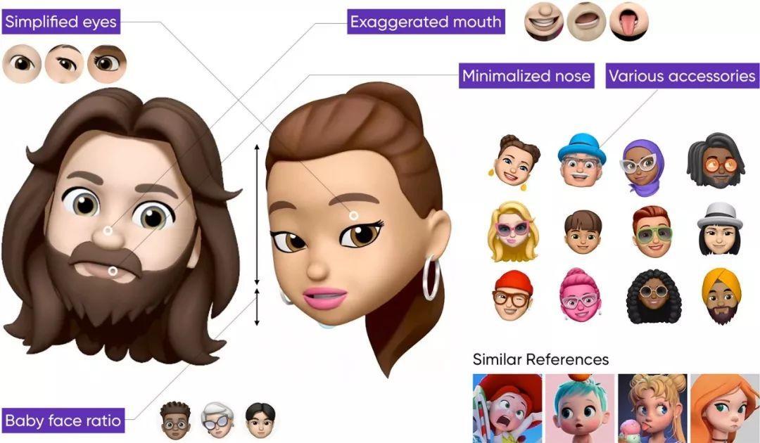 Apple 注重简洁、清晰和丰富的情感。Memoji旨在通过动态移动所有部件来简化人脸的形状,并最大限度地利用人脸识别技术。这种简单而圆润的脸给人一种卡通般可爱的印象。