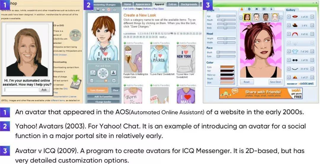 大多角色服务都提供各种平台来让用户创建属于自己的角色。用户可以在调色板中通过选择头发和眉毛来创建多个面部组合,然后选择最为合适的(通常和自己相似)的那一个。像这个现有的 2D 角色,它就是通过选择已经在库里准备好的图像然后将其组合而成。然而,如果是 3D 角色,随着3D技术的进步,用户可以直接调整脸部的详细尺寸和位置,这使得每个用户都能拥有与其他人区分开来的属于自己的角色,给予了用户极大的沉浸感和更高的满意度。