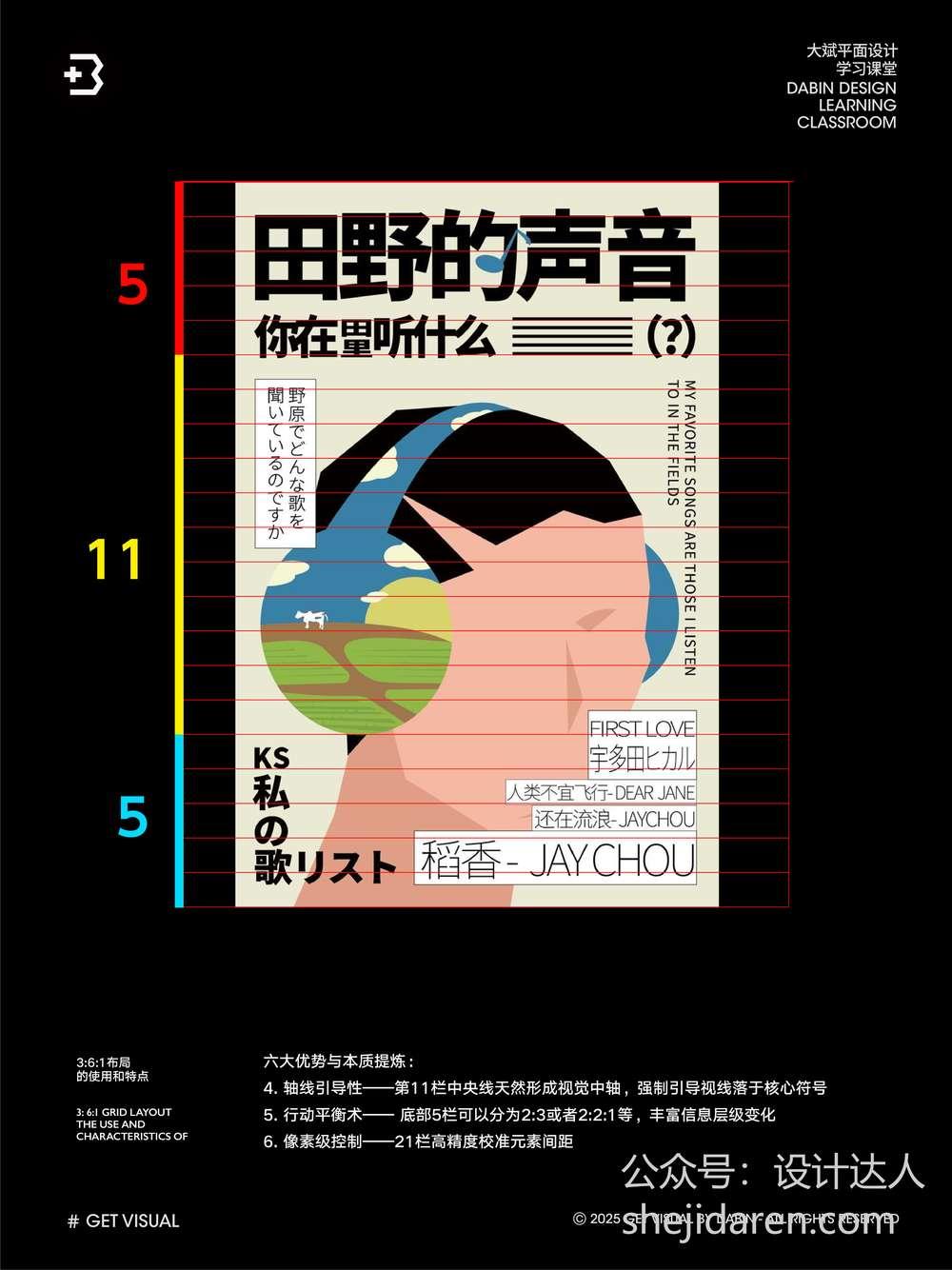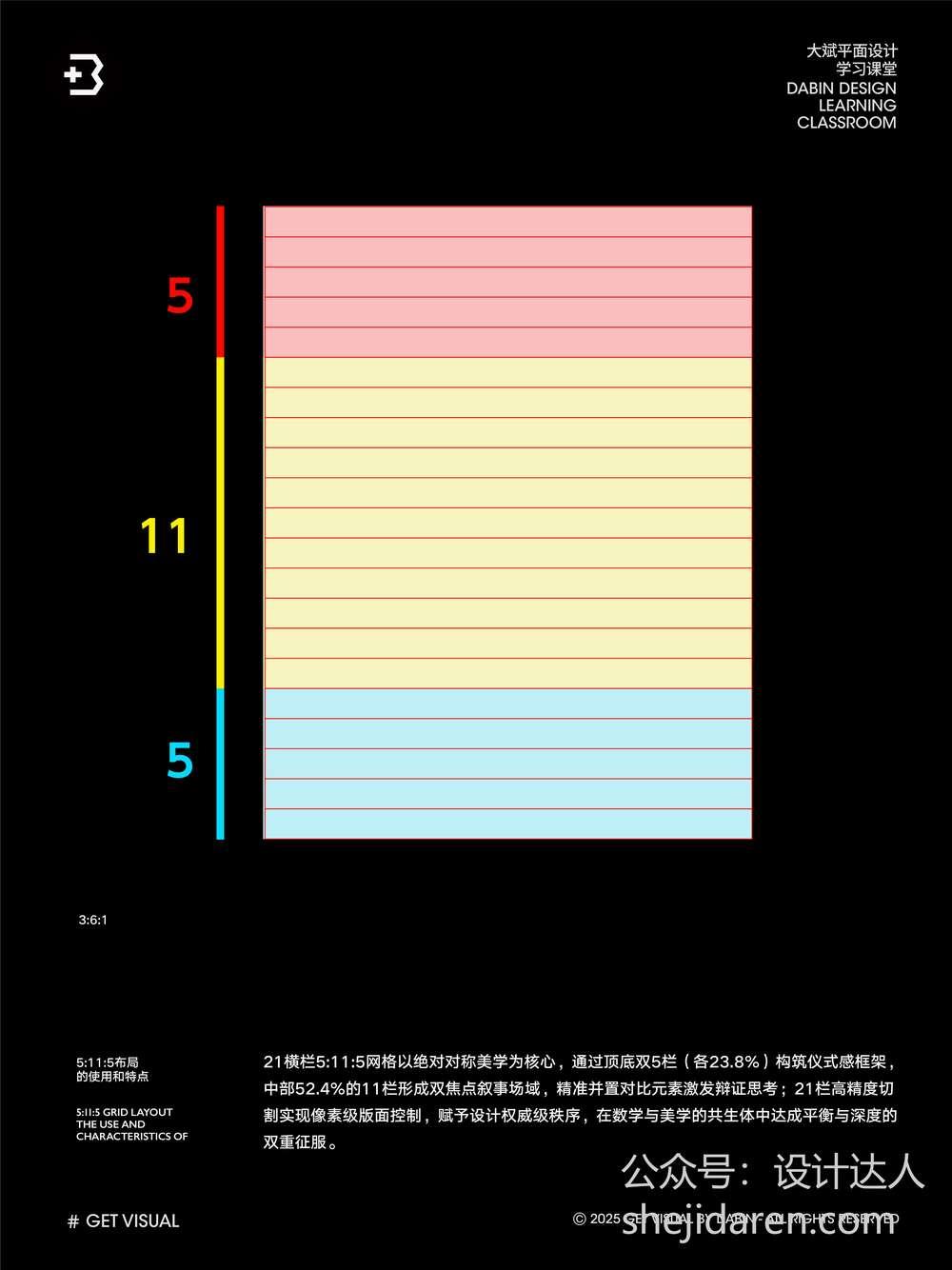 21横栏5:11:5网格以绝对对称美学为核心,通过顶底双5栏(各23.8%)构筑仪式感框架,中部52.4%的11栏形成双焦点叙事场域,精准并置对比元素激发辩证思考;21栏高精度切割实现像素级版面控制,赋予设计权威级秩序,在数学与美学的共生体中达成平衡与深度的双重征服。