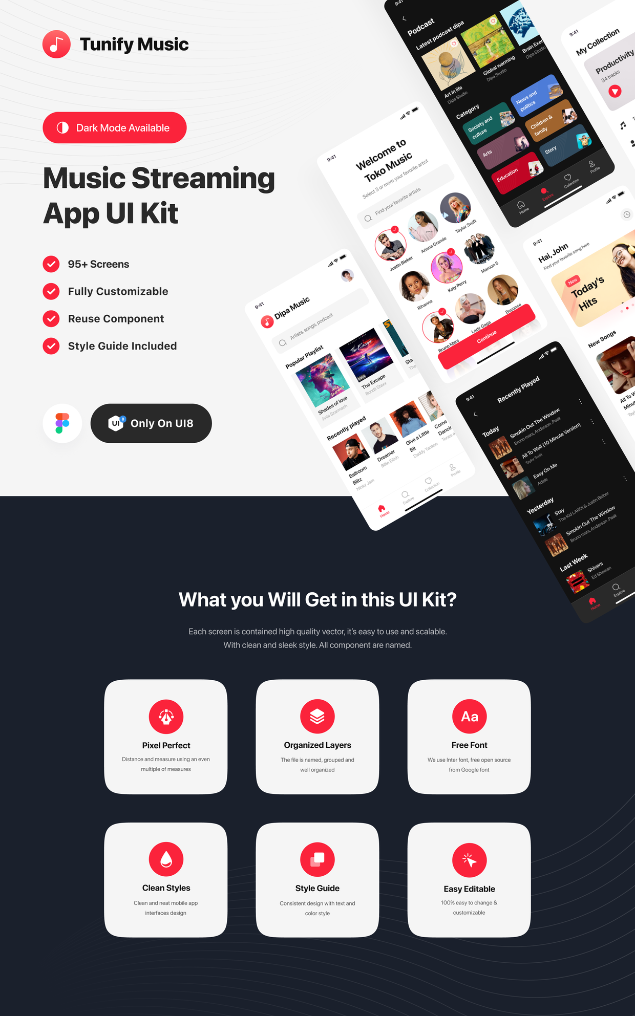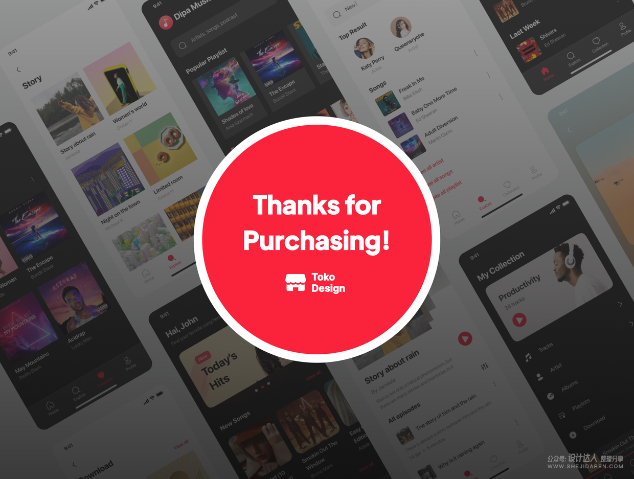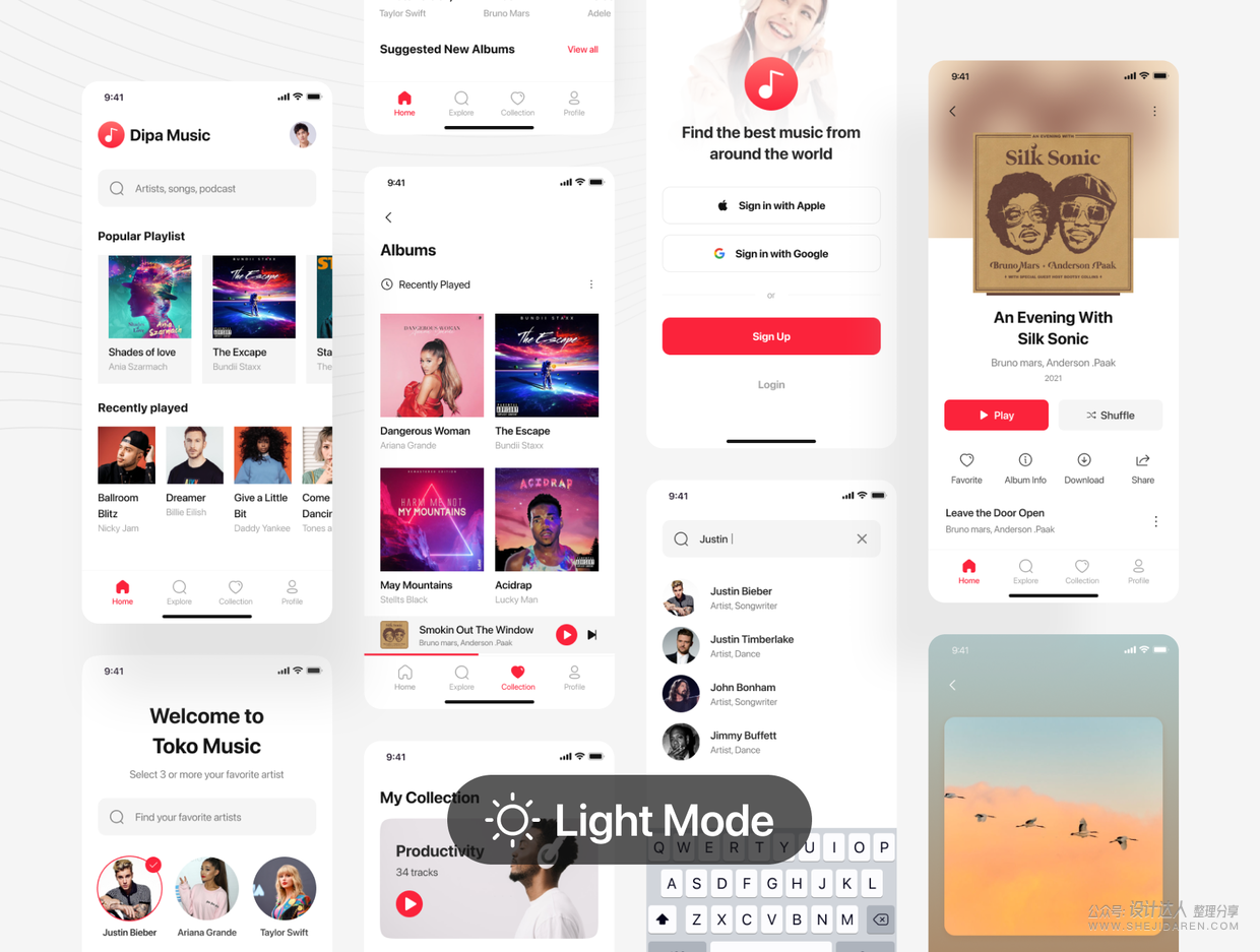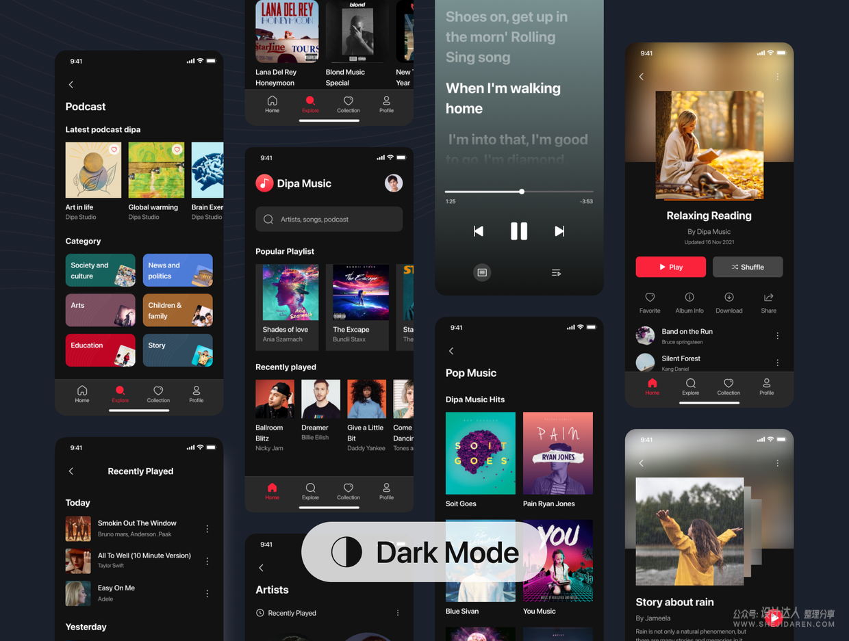 今天分享一个完美的音乐流媒体应用程序UI套件,由95+像素完美的屏幕组成,该套件很容易根据你的喜好完全定制,包括全局颜色、字体样式等,有明暗主题可选。简单、干净、现代的设计风格非常百搭。