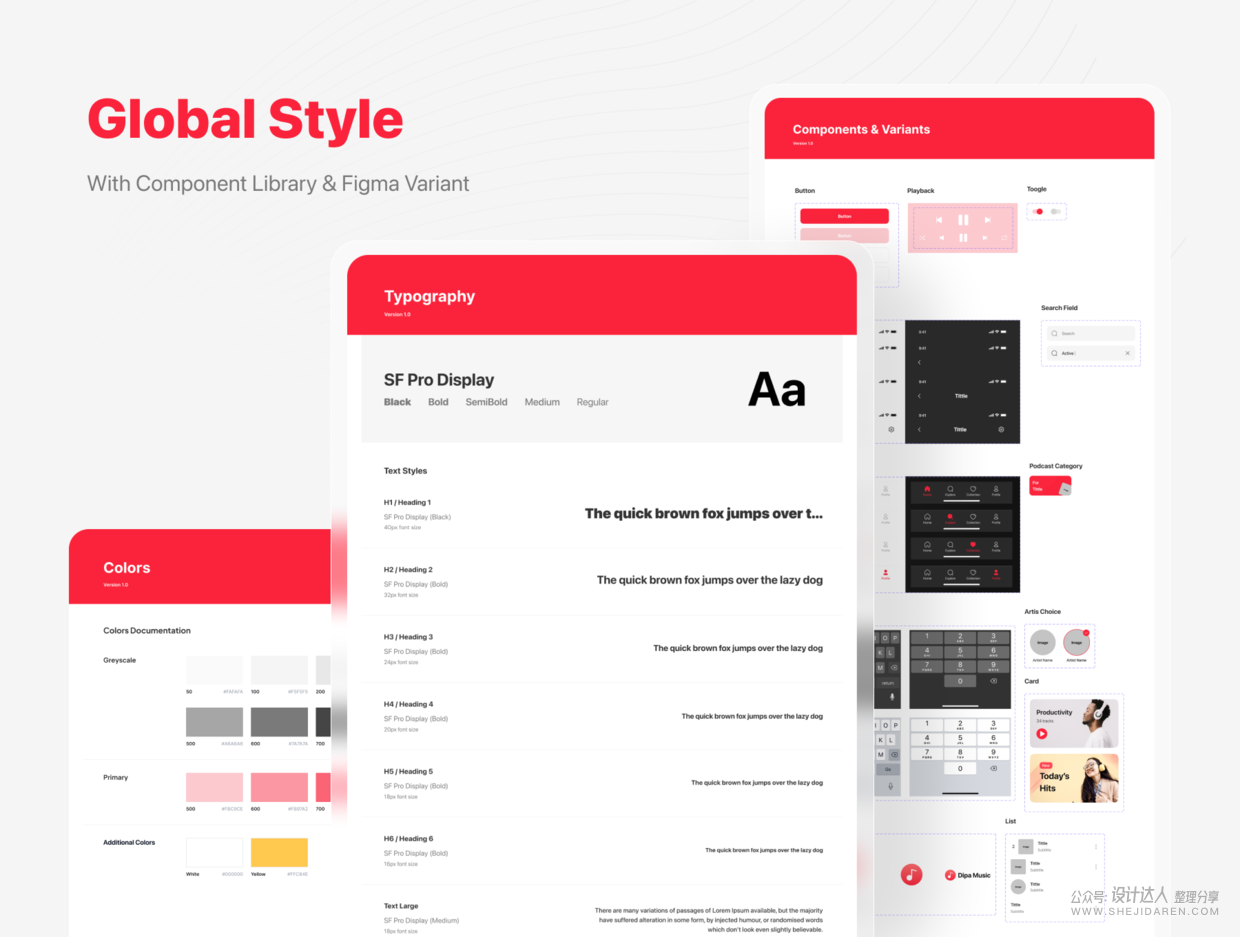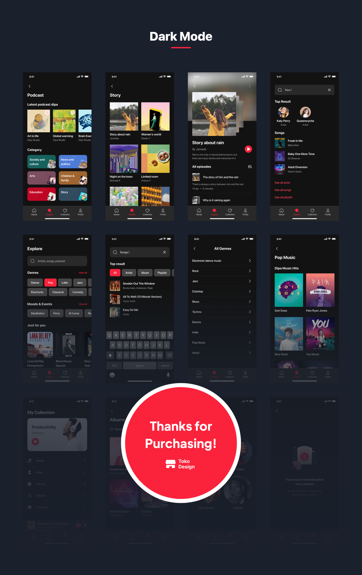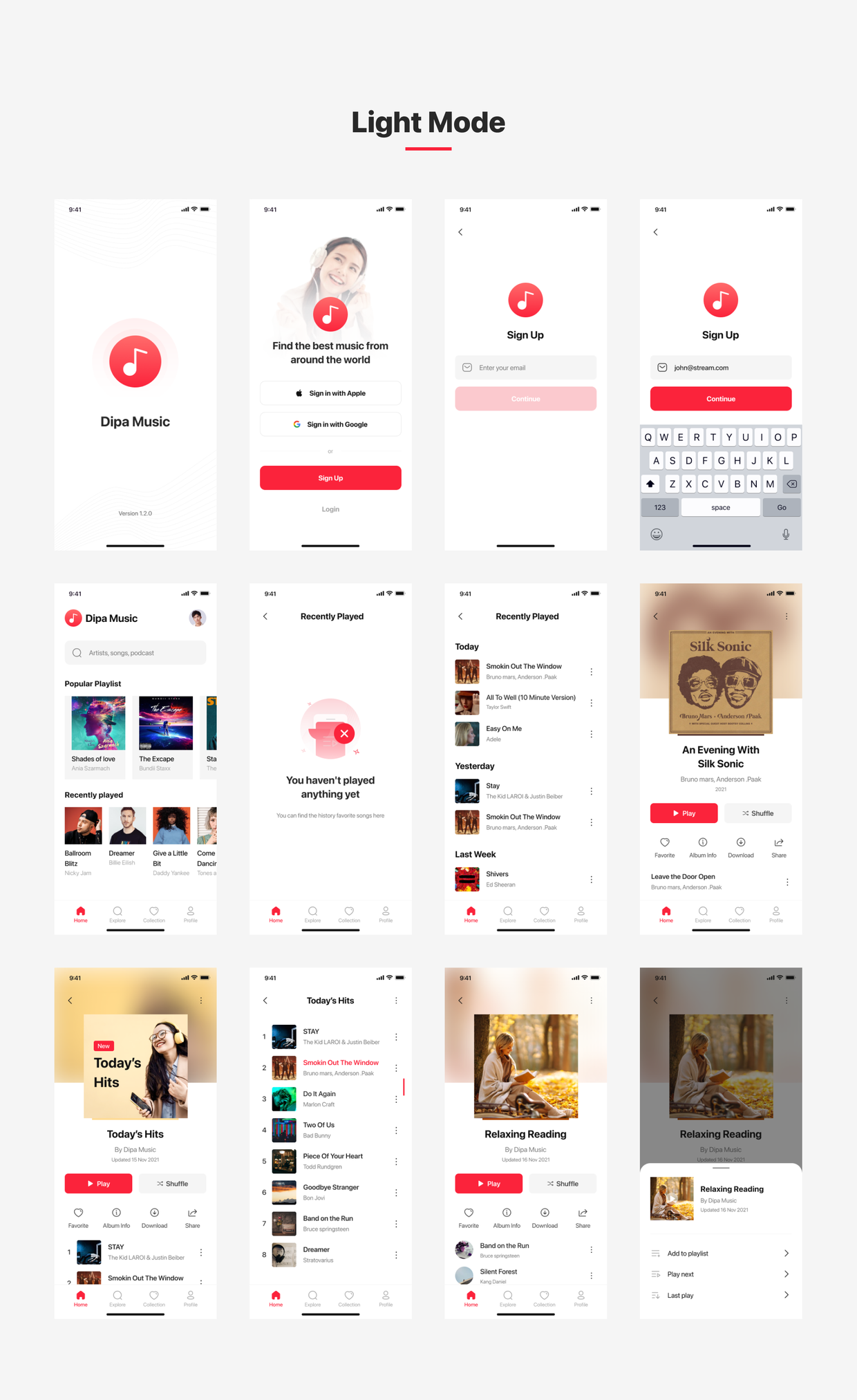 今天分享一个完美的音乐流媒体应用程序UI套件,由95+像素完美的屏幕组成,该套件很容易根据你的喜好完全定制,包括全局颜色、字体样式等,有明暗主题可选。简单、干净、现代的设计风格非常百搭。