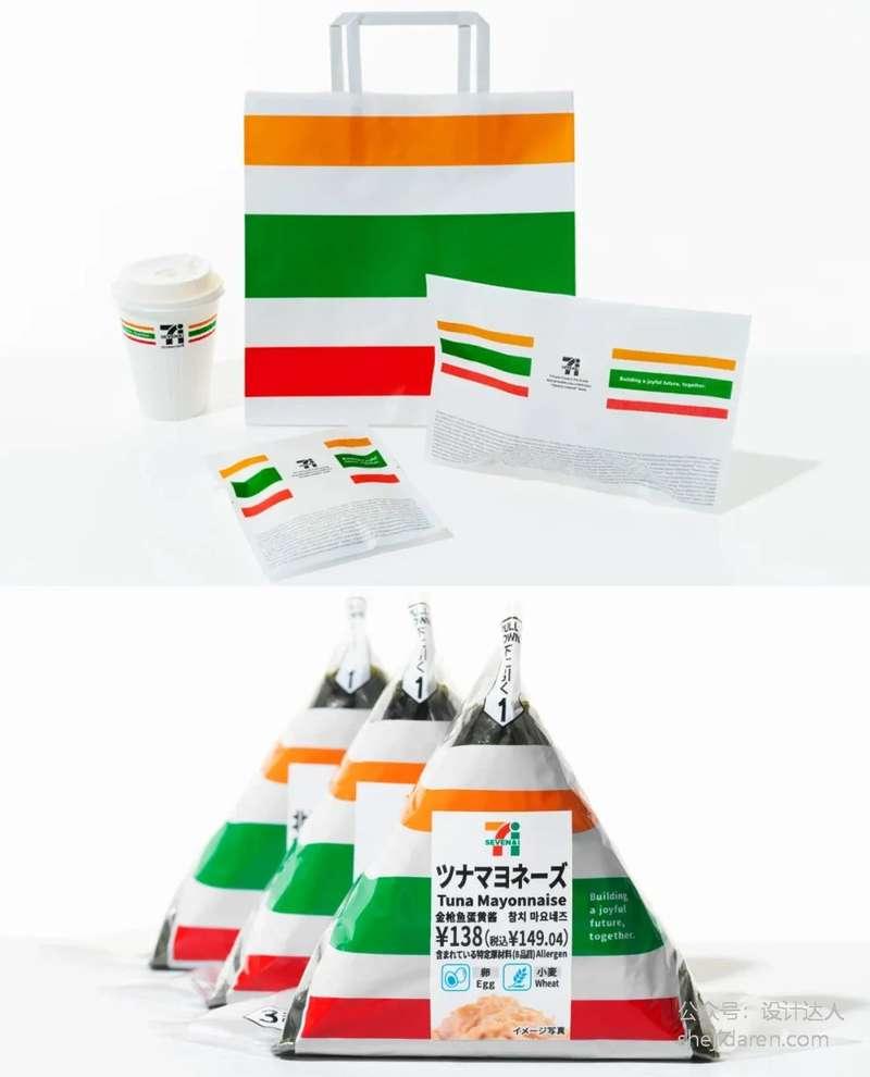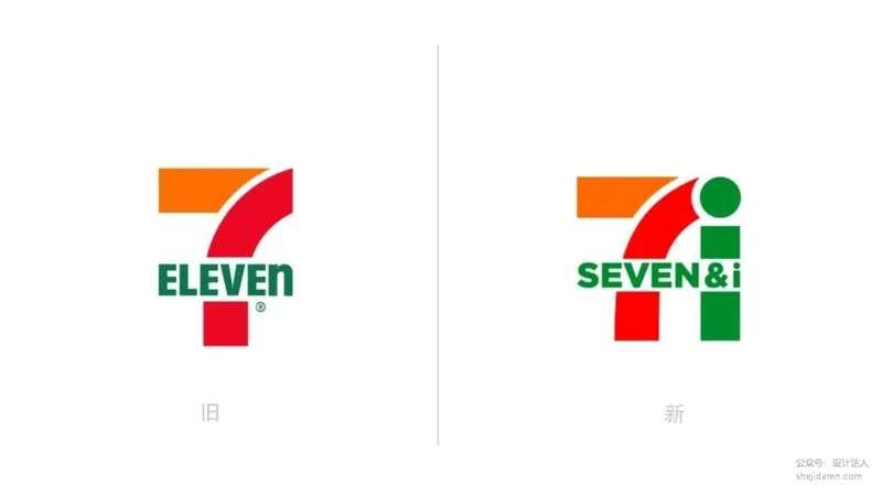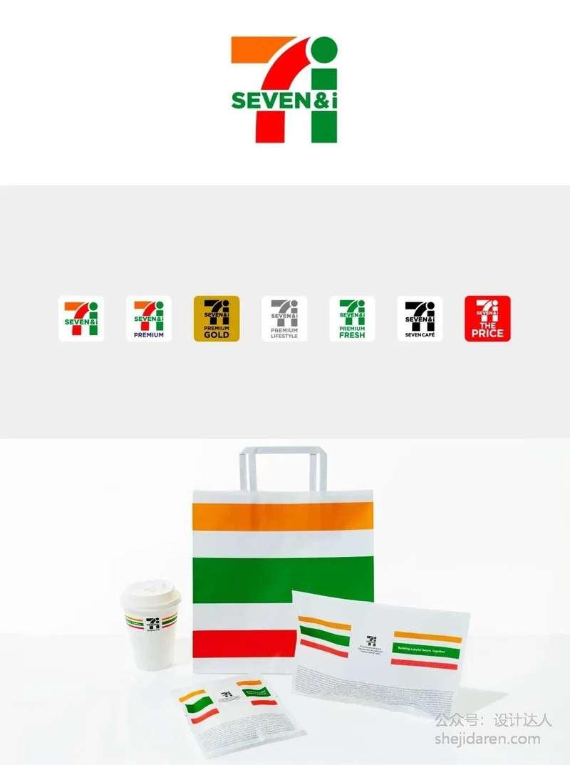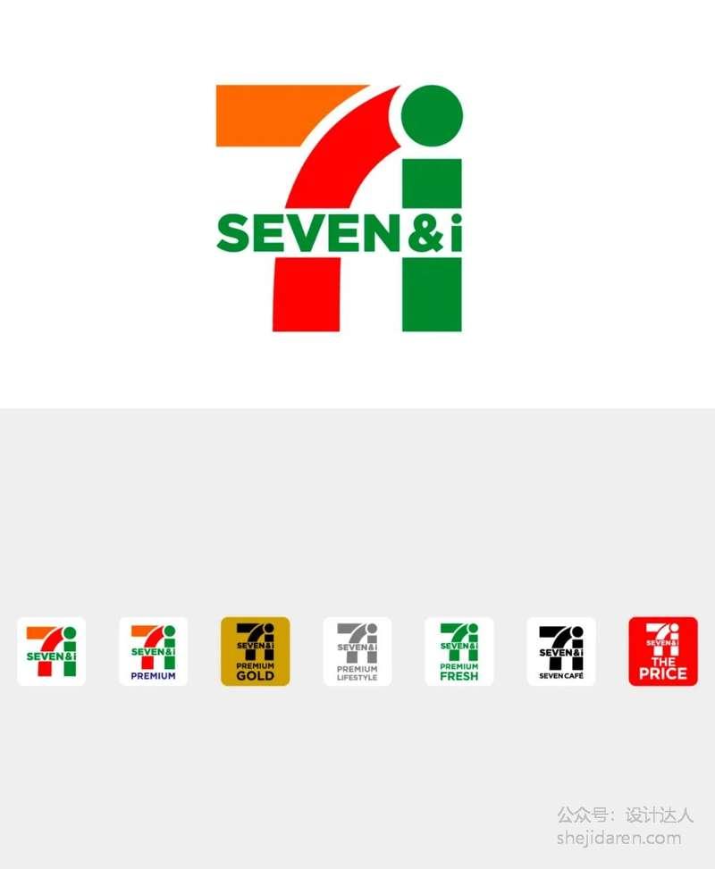 佐藤的设计理念很简单:做减法。他保留红、橙、绿三色条纹和文字,更加醒目。绿色的“SEVEN&i”字体简洁现代,“i”采用矩形和圆形,形状简洁,易于识别,同时也与橙色和红色的“7”形成了良好的对比,增强了整体的视觉效果。