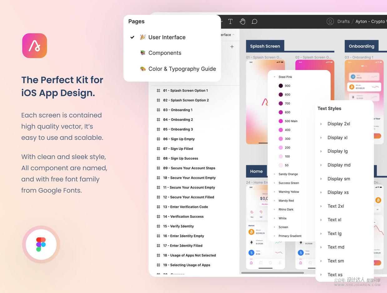 Ayton是一个加密钱包应用程序UI套件,具有简洁时尚的风格,包含70多个高质量的屏幕,具有响应性调整大小功能,适用于iPhone X/11 Pro屏幕尺寸(375px X 812px)的iOS,全局颜色和文本样式,以及Google Fonts (Poppins)的免费字体系列。支持Figma和在线编辑。
