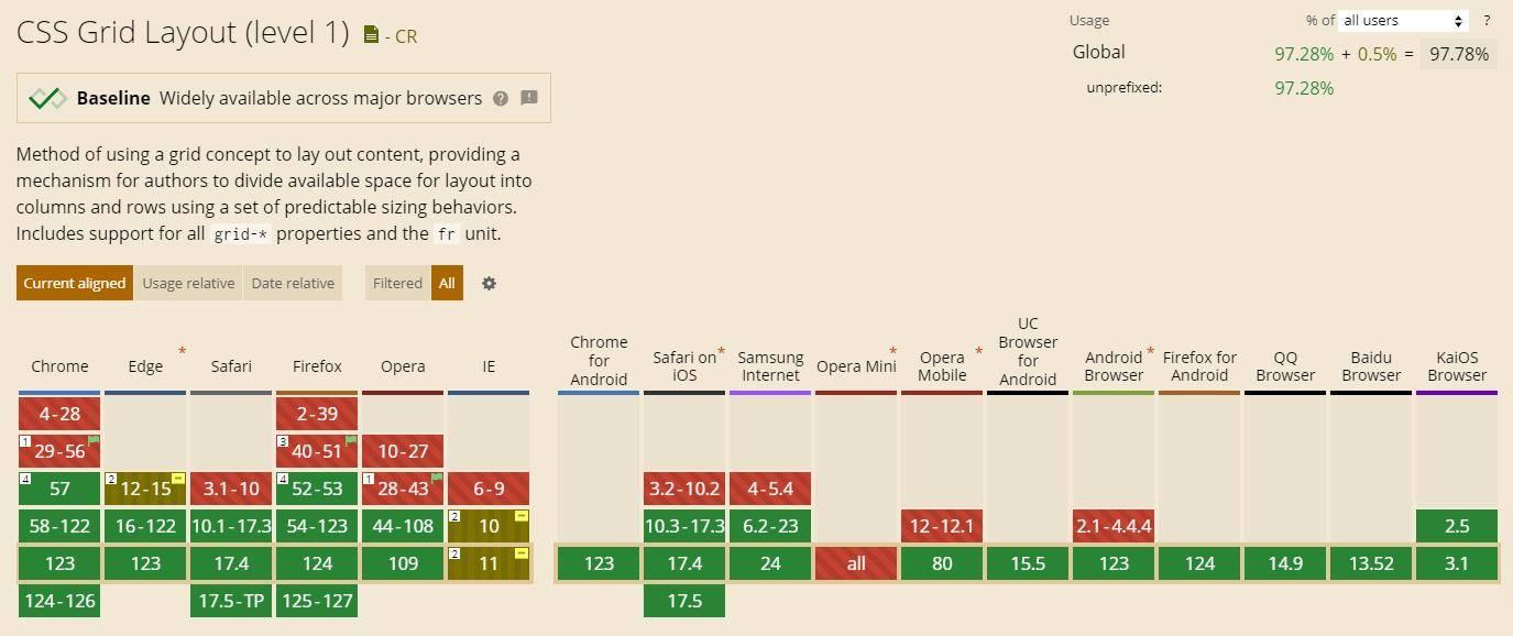 CSS 网格布局(1 级)的浏览器兼容性得分为 97。这是一个集体分数(满分 100 分),代表浏览器对 Web 技术的支持。