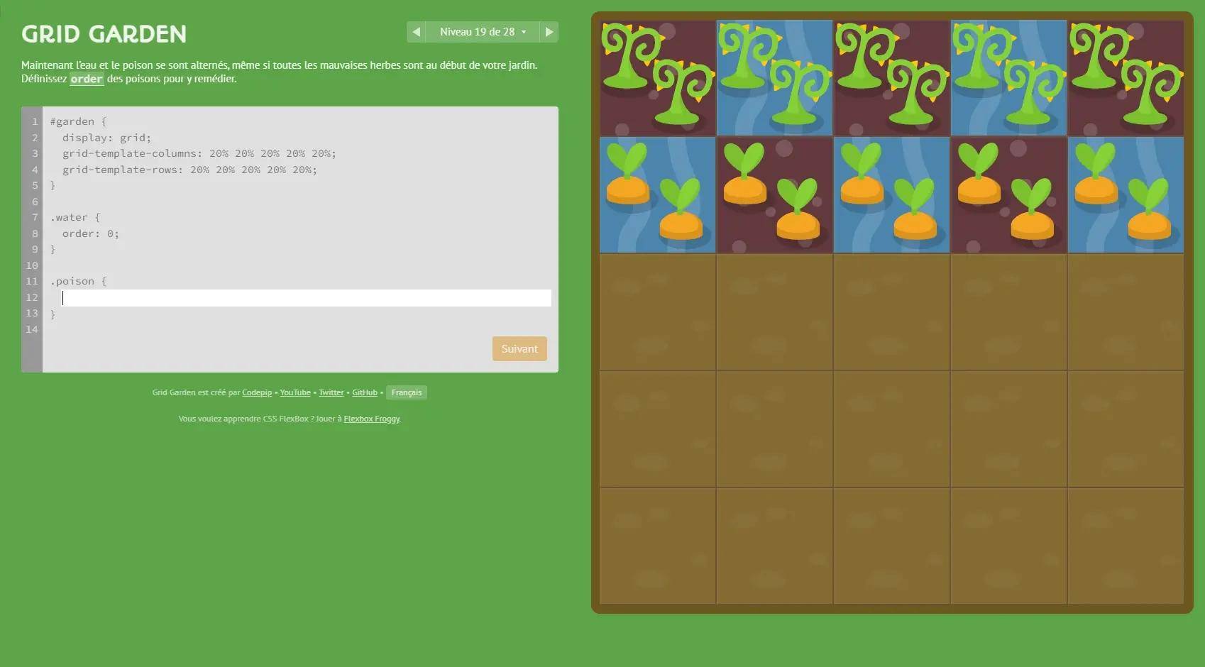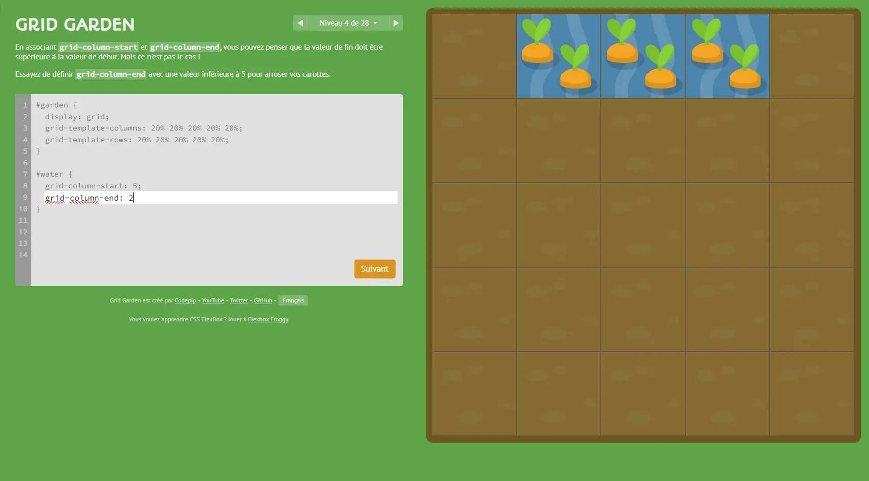 在这个游戏中,目标是使用 Grid Layout 的 CSS 属性给胡萝卜浇水和毒害杂草。