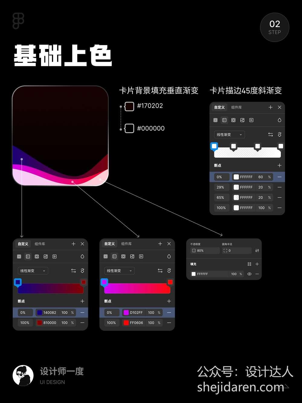 Step2:叠加渐变色彩✔️卡片背景:垂直渐变(#FFFFFF 不同透明度叠加,层次感立马有)✔️描边用 45 度斜渐变(D102FF+FF0606 撞色,瞬间吸睛!)