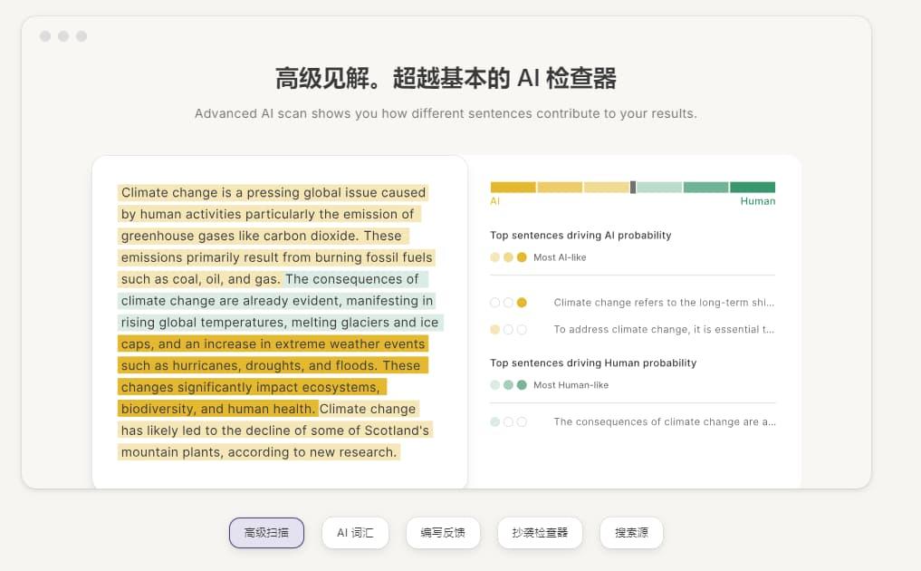 一眼揪出 AI 痕迹上传文本 / 粘贴内容,秒级扫描 ChatGPT、Claude 等 N 种 AI 模型生成的文字,连句子级别的 AI 词汇都能高亮标红!再也不怕被假原创骗啦~