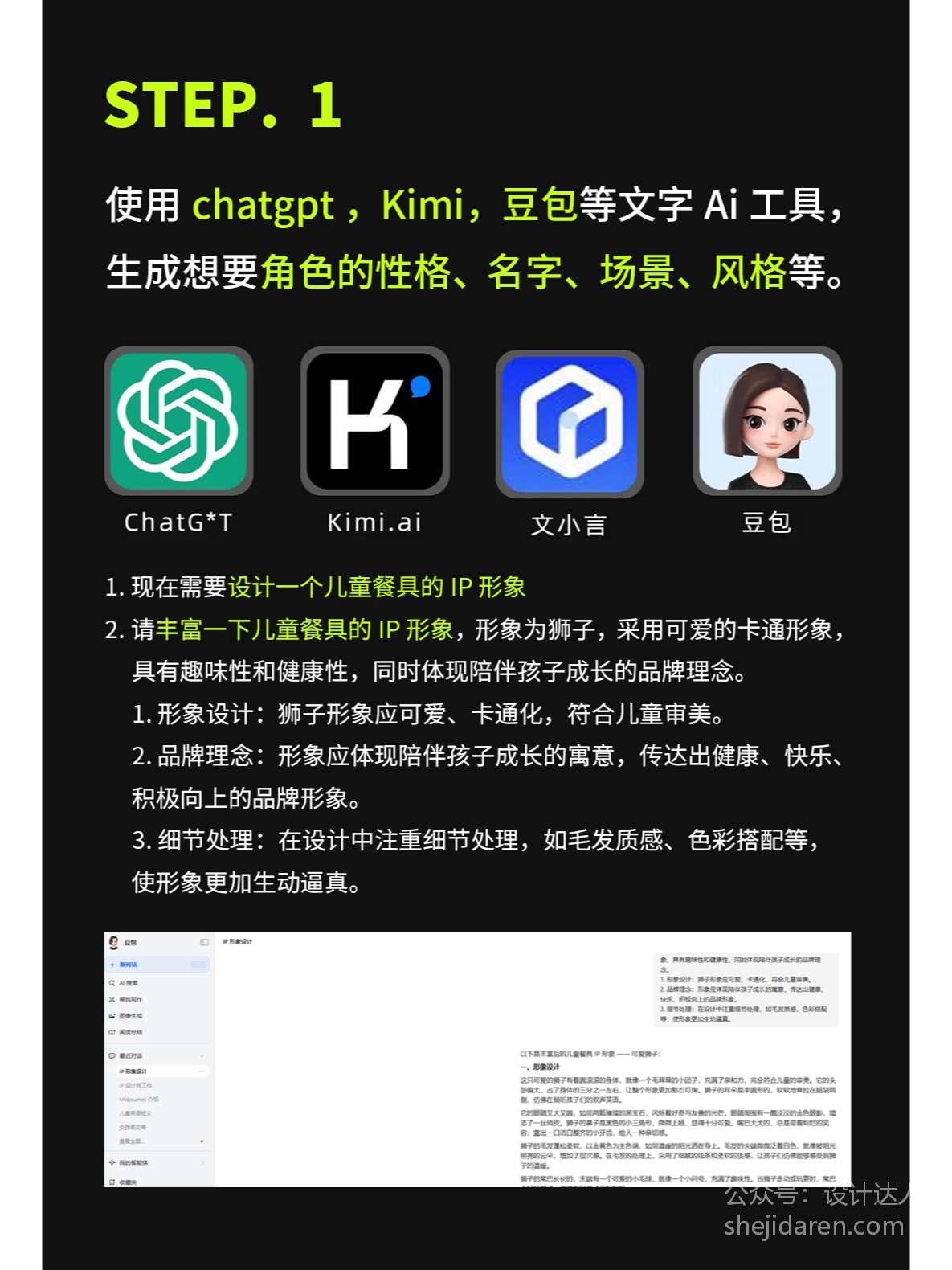 1、使用chatgpt ,Kimi,豆包等文字Ai工具,生成想要角色的性格、名字、场景、风格等。这一步很重要,帮助你理清设计思路,确定设计方向,是整个设计的基础!!!