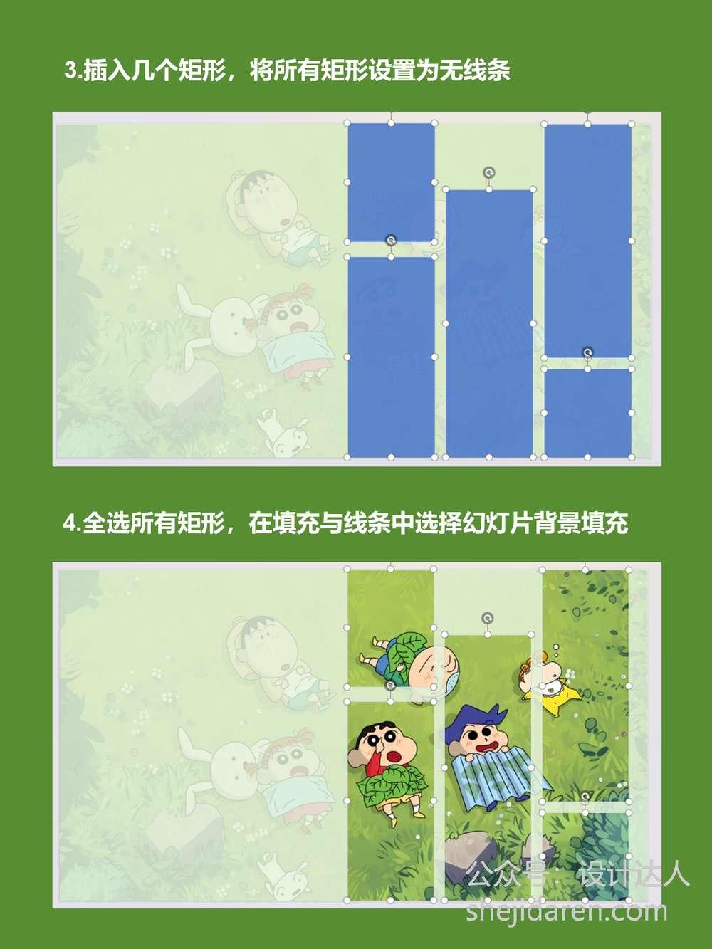 选中这 5 个小矩形,右键 “形状填充” 里选 “幻灯片背景填充”!这样矩形就会和第一步的背景融合,还带着 Step2 叠的淡色底纹,层次一下子就有了,不会像贴上去的补丁~