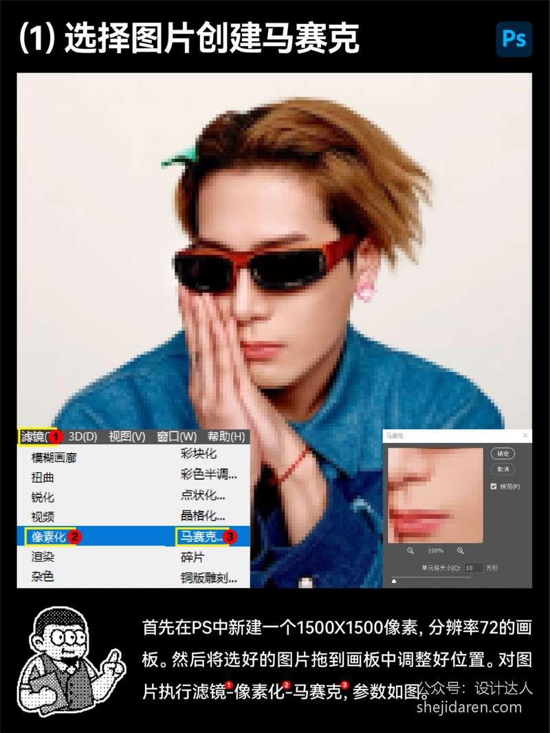 首先,在Photoshop中新建一个1500×1500像素,分辨率72的画板。然后将选好的图片拖到画板中调整好位置。对图片执行滤镜-像素化-马赛克,参数如图。