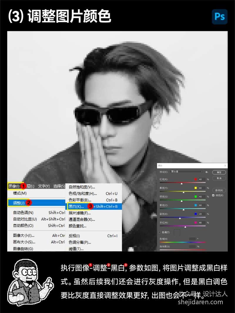 执行图像-调整-黑白,参数如图,将图片调整成黑白样式。虽然后续我们还会进行灰度操作,但是黑白调色要比灰度直接调整效果更好,出图也会不一样。