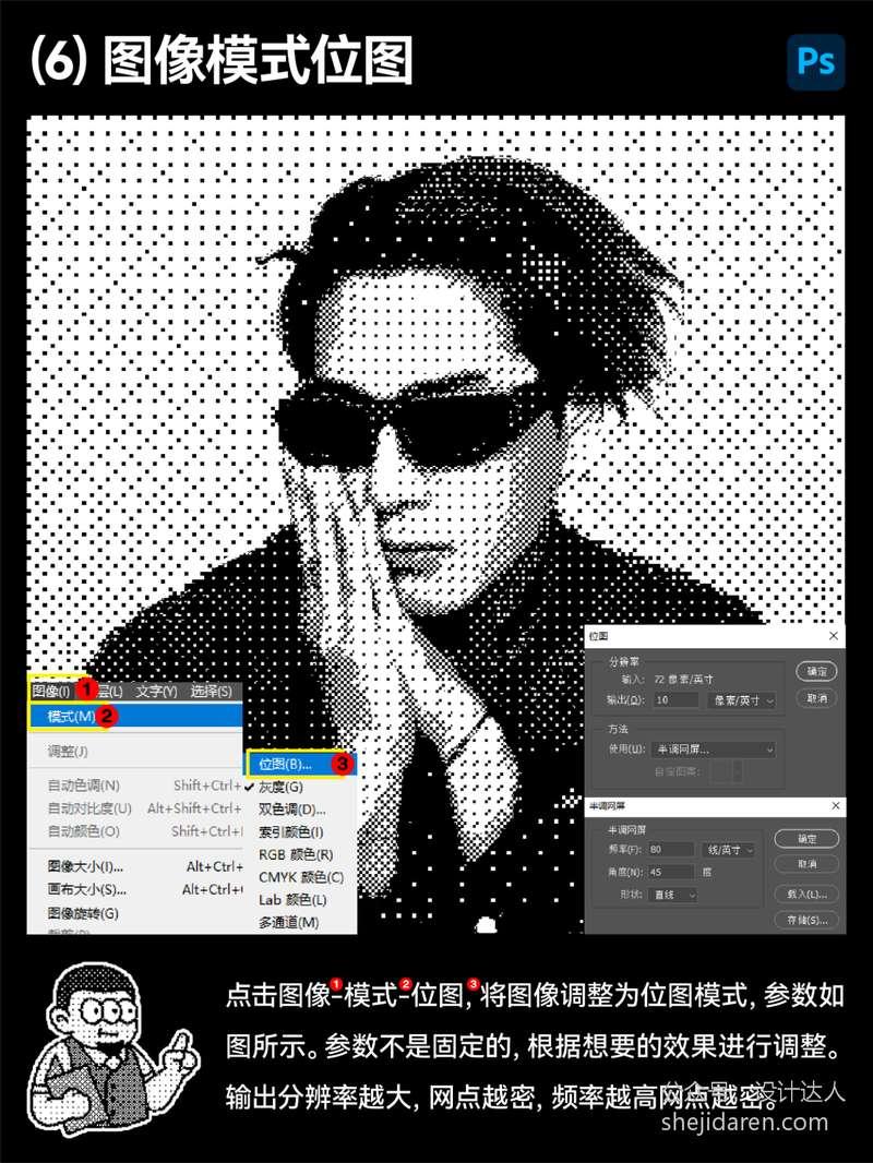 点击图像-模式-位图,将图像调整为位图模式,参数如图所示。参数不是固定的,根据想要的效果进行调整。输出分辨率越大,网点越密,频率越高网点越密。
