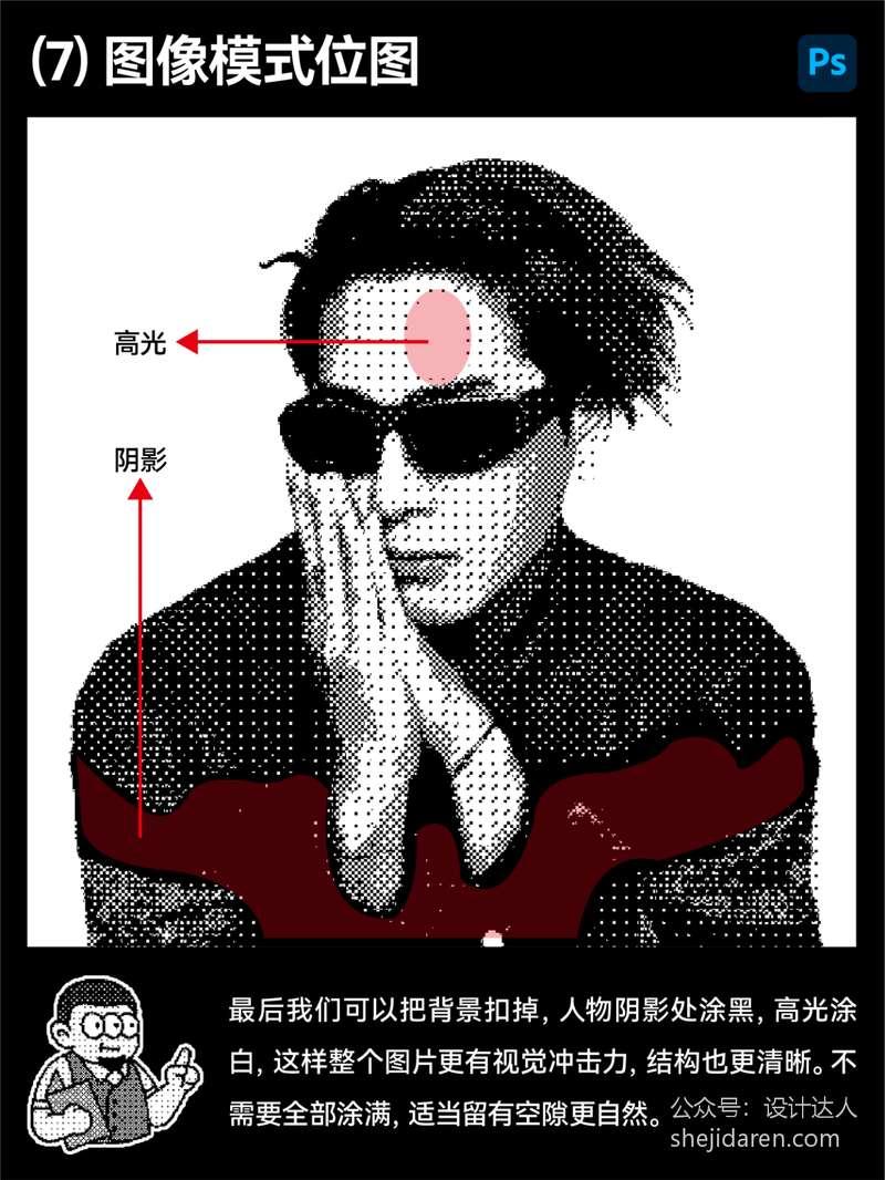 最后我们可以把背景扣掉,人物阴影处涂黑,高光涂白,这样整个图片更有视觉冲击力,结构也更清晰。不需要全部涂满,适当留有空隙更自然。