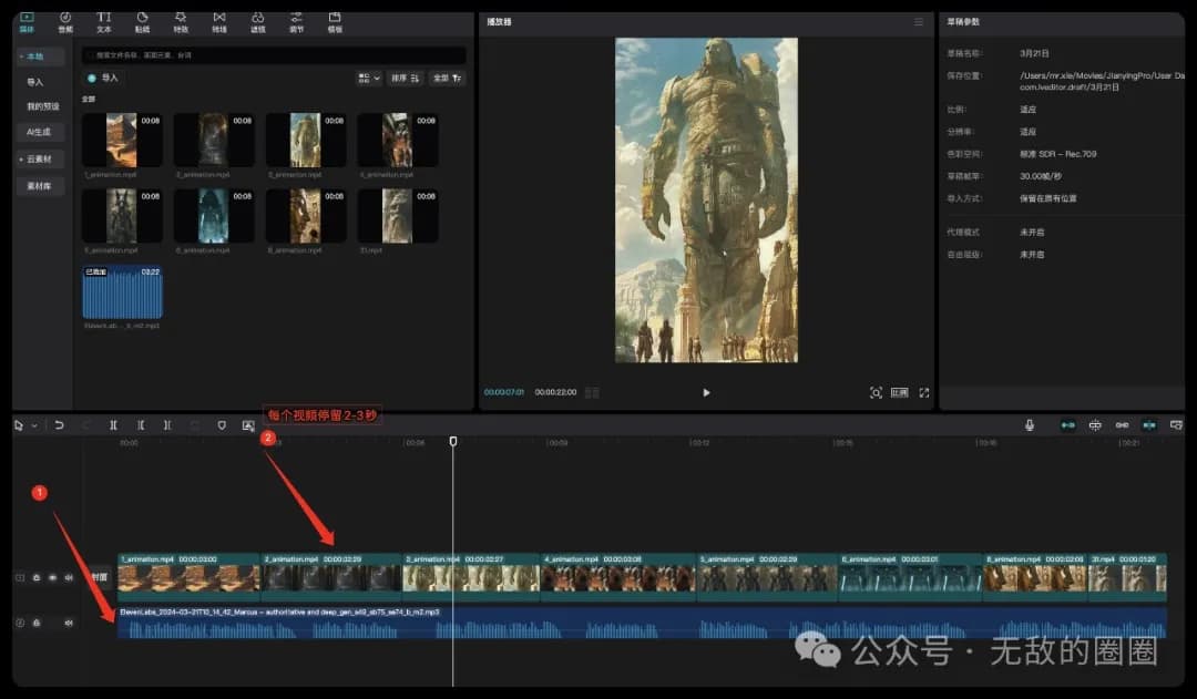 文案,声音,画面到这里我们都搞定了,接下来将所有素材导入到剪映中,将音频拖入音轨,每个画面保存三秒就足够了,以提到短视频留存!