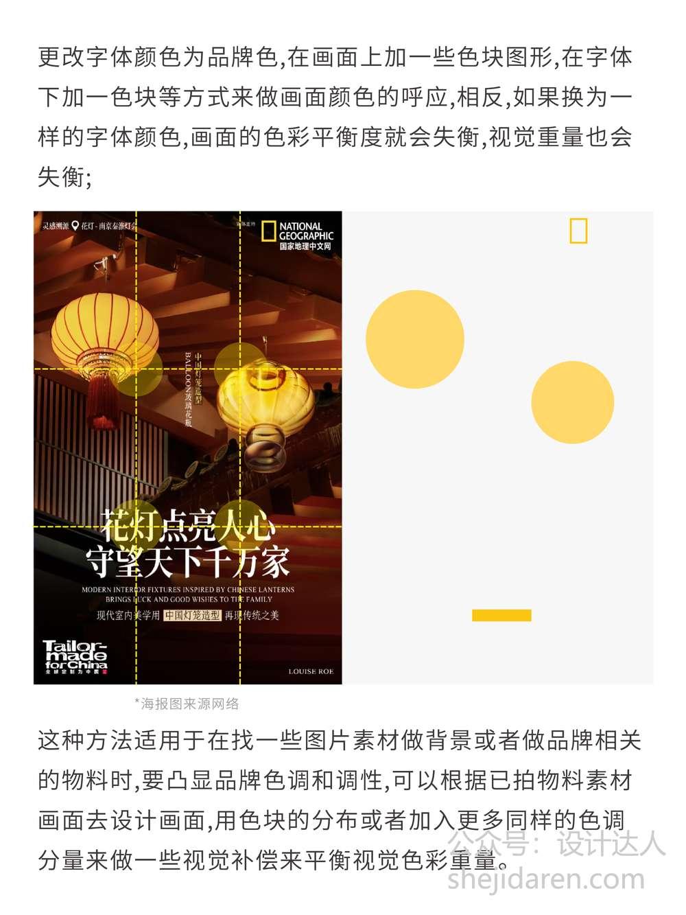 比如通过在字体下加色块等方式,能形成画面颜色的呼应;反之,如果所有字体都采用一样的颜色,画面的色彩平衡度和视觉重量就容易失衡。当我们使用图片素材做背景或设计品牌相关物料时,为了凸显品牌色调和调性,可以根据素材画面,通过色块分布或增加同色调分量来进行视觉补偿,平衡视觉色彩重量。