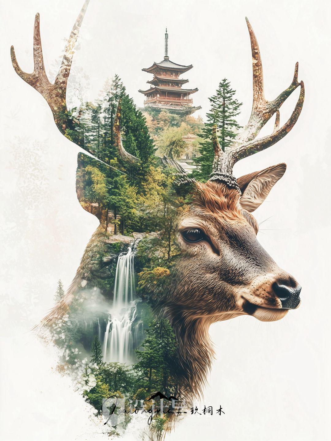 Double exposure illustrations of Asian-style deer heads with antlers and temples, mountains, waterfalls and green trees双重曝光插图的亚洲风格的鹿头与鹿角和寺庙,山脉,瀑布,绿树;