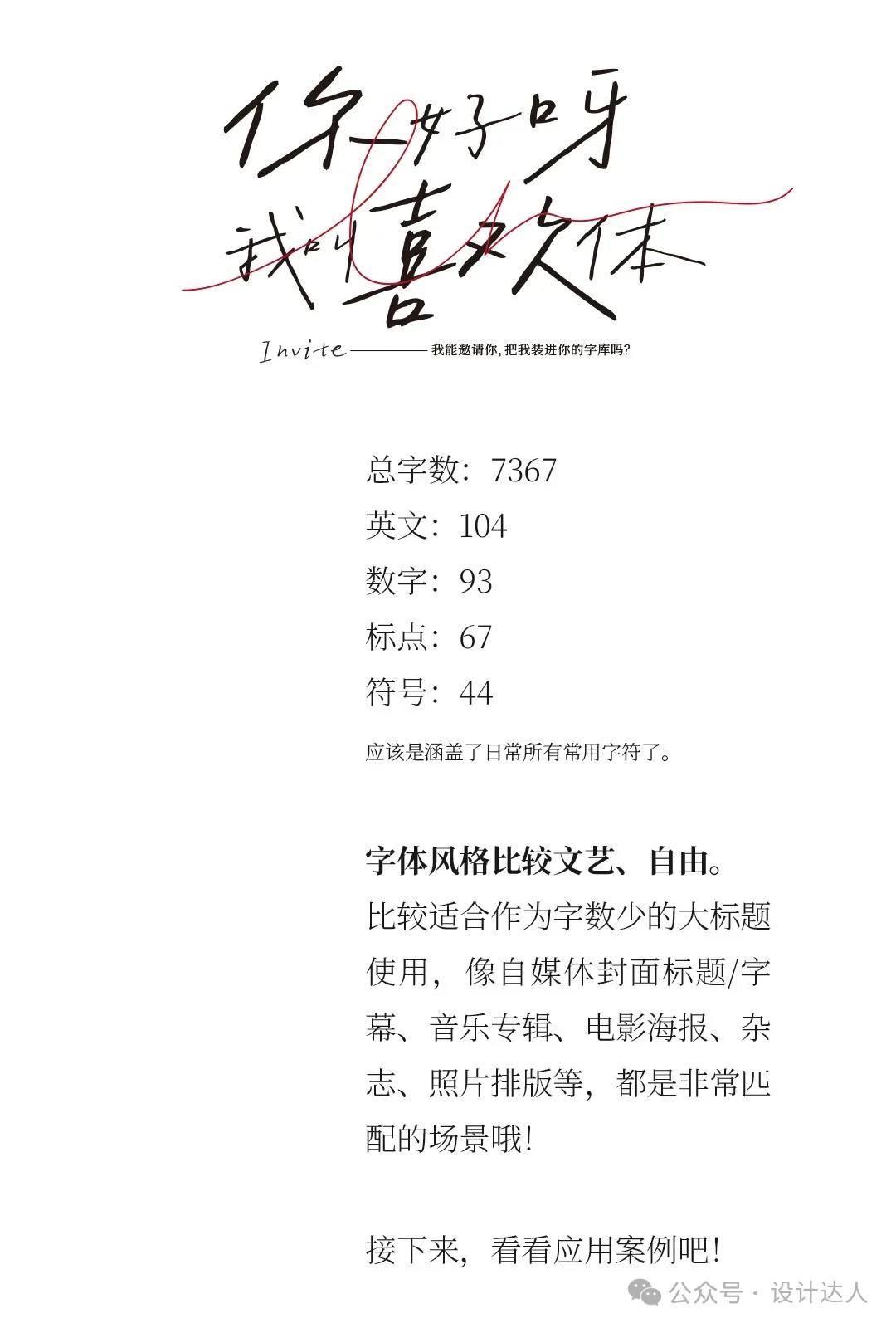 这款字体的总字数达到了惊人的7367字,英文字符104字,数字93字,标点符号67个,以及44个符号。可以说,它几乎涵盖了我们日常使用的所有常用字符。无论你需要表达什么样的内容,喜脉喜欢体都能满足你的需求。