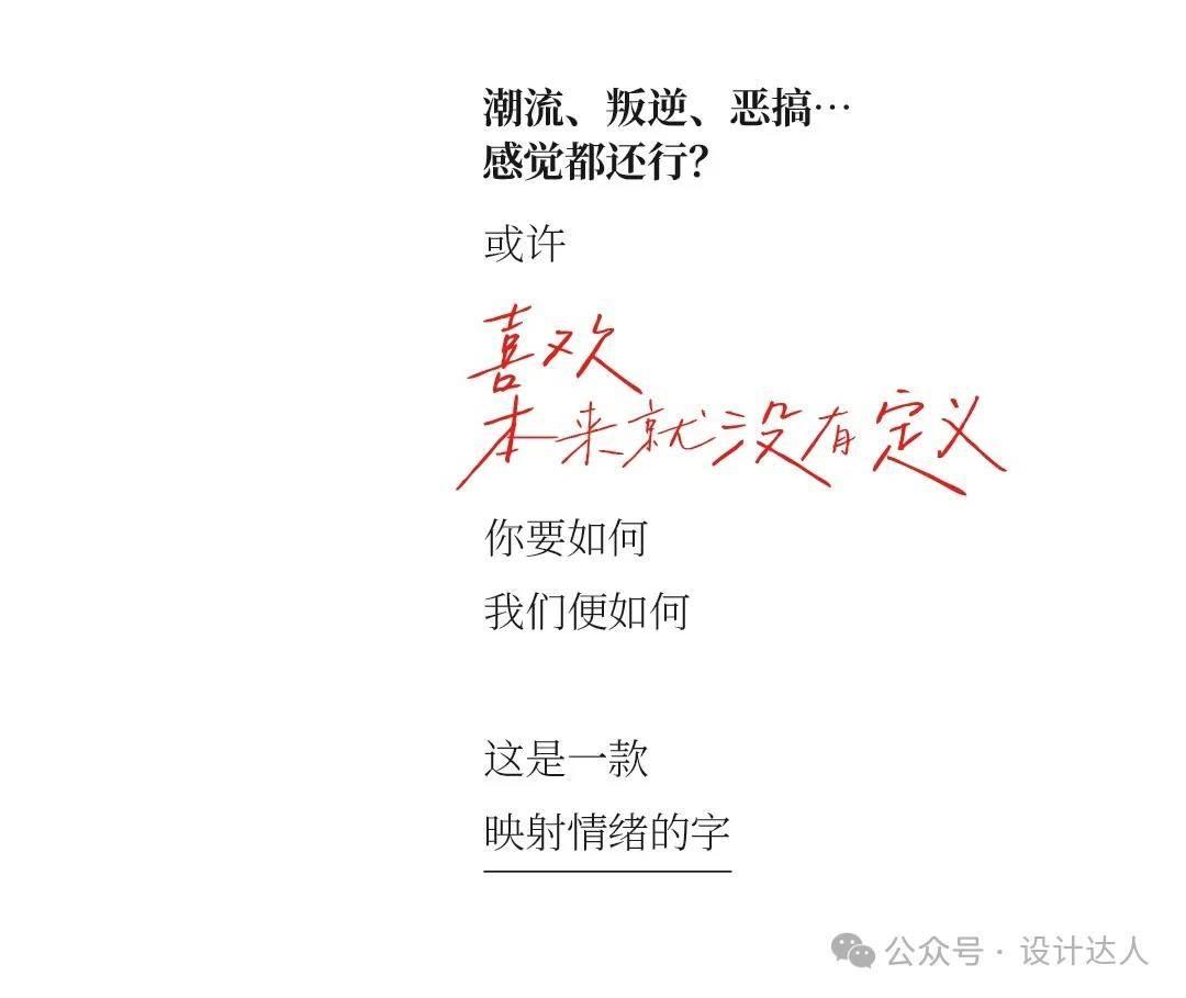 喜脉喜欢体的风格非常文艺和自由,它适合用于字数较少的大标题。这种字体的美感和独特性,让它在众多设计中独树一帜。无论是在自媒体的封面标题,还是在音乐专辑的封面,甚至是电影海报上,喜脉喜欢体都能成为吸引眼球的焦点。