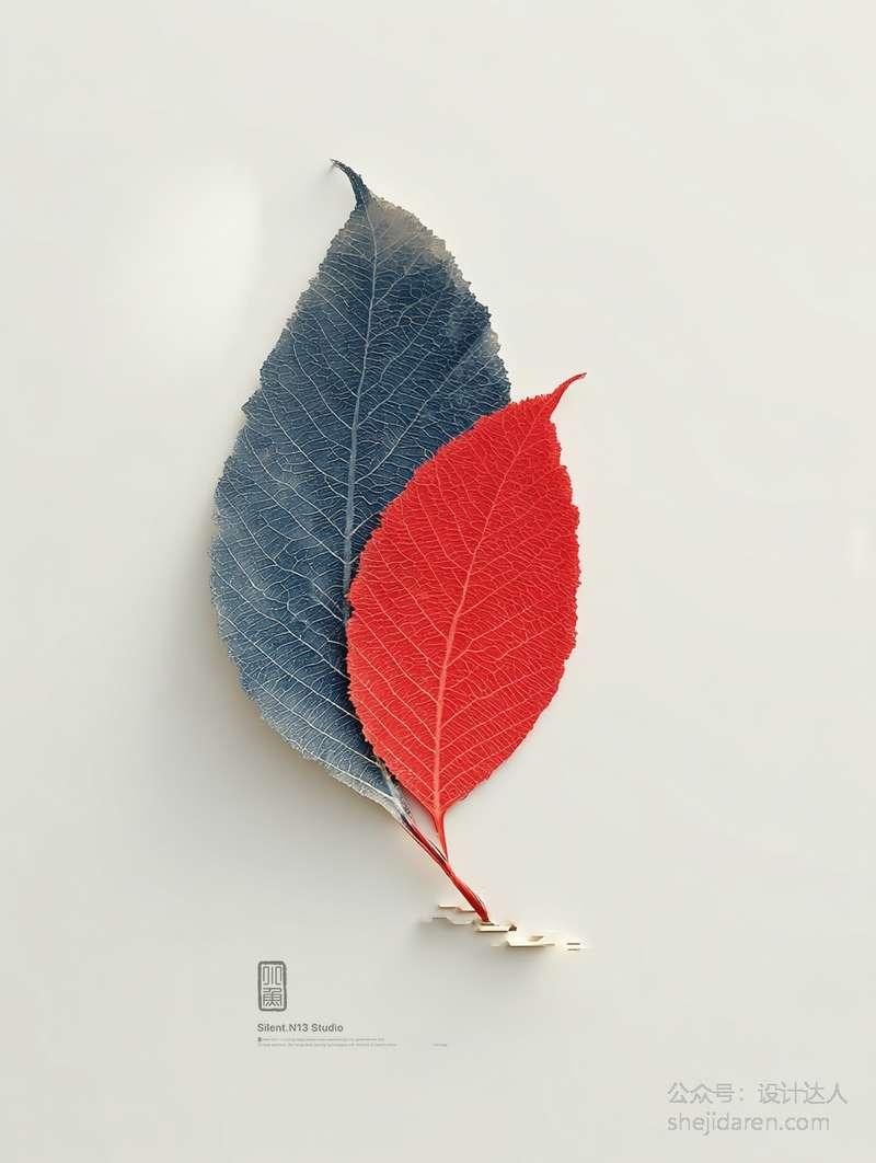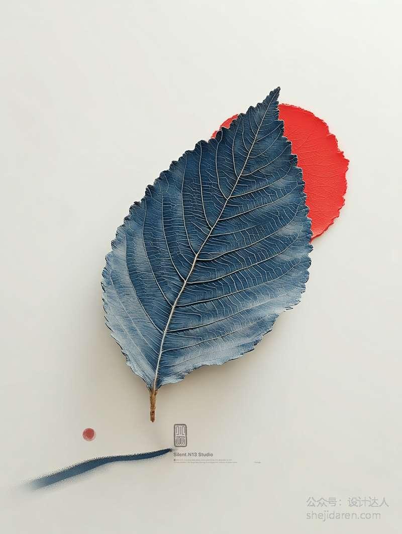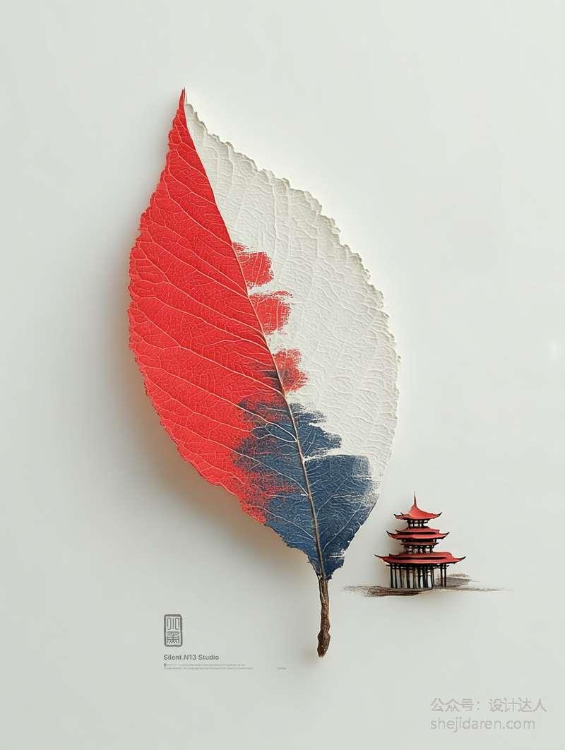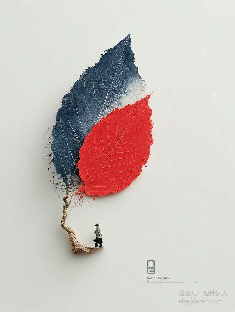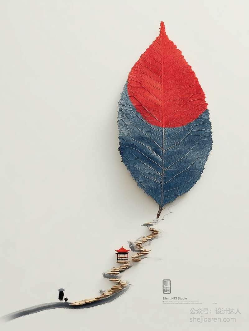 比如有一幅作品画面右侧那片红色的树叶纹理清晰,逼真到仿佛可以触摸。树叶与背景的山水画自然衔接,背景的山水画采用了典型的中国传统风格,冷色调的蓝、黑描绘出山峰和树木,营造出一种悠远、空灵的意境。