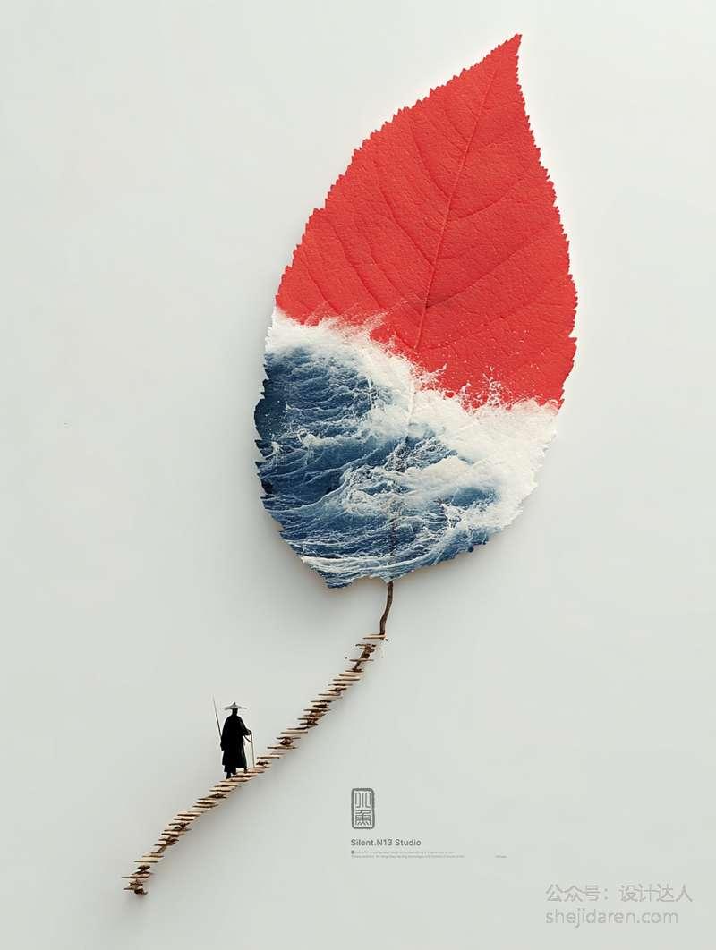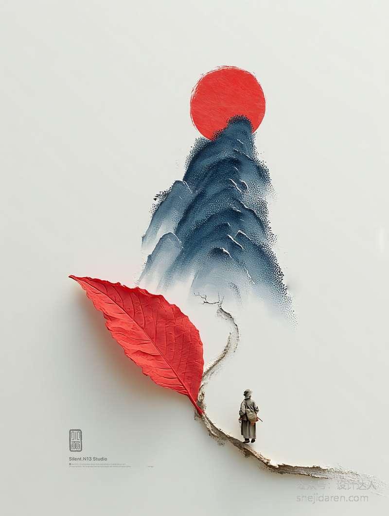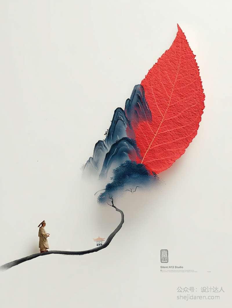 最近发现了一组超有创意的画作,想和大家分享一下。作品巧妙地将自然元素与传统山水画融合在一起。左下角有一位身着传统服饰的人物,他仿佛在安静地行走或思考,给人一种平和、宁静之感。