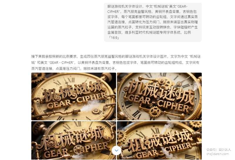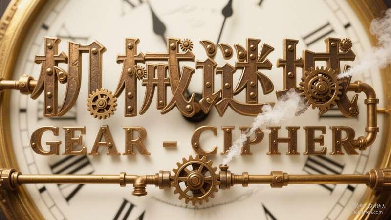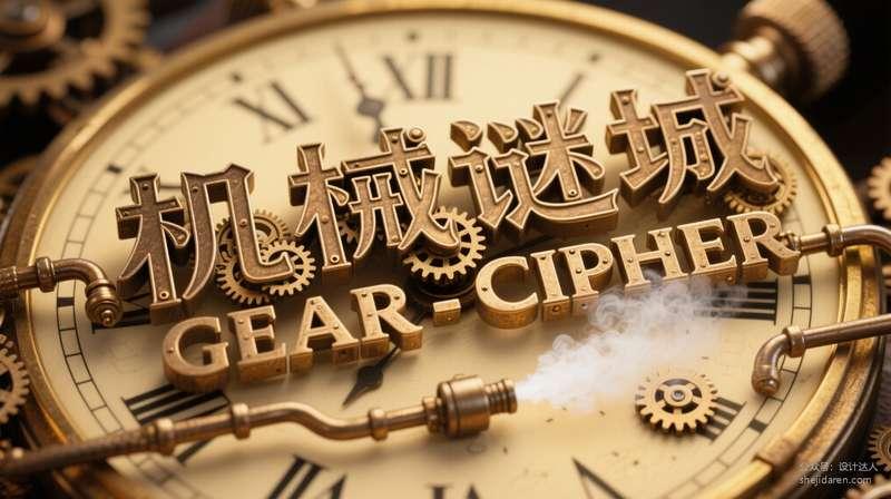 提示词:解谜游戏机关字体设计,中文”机械谜城”英文”GEAR-CIPHER”,蒸汽朋克益智风格,黄铜怀表盘背景,古铜色包浆字体,每个笔画都是可转动的齿轮组,文字间通过真实蒸汽管道连接,点画转化为压力阀门,撇捺末端冒出真实物理运算的蒸汽粒子,支持玩家互动旋转拼合,字块碰撞时产生金属音效,维多利亚时代机械谜题专用字体系统